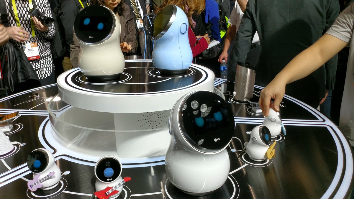 LG представила несколько роботов — домашних LG Hub Robot и Hub Robot Mini с поддержкой голосового ассистента Alexa, робота-гида для работы в аэропортах Airport Guide Robot и промышленный пылесос для аэропортов Airport Cleaning Robot.